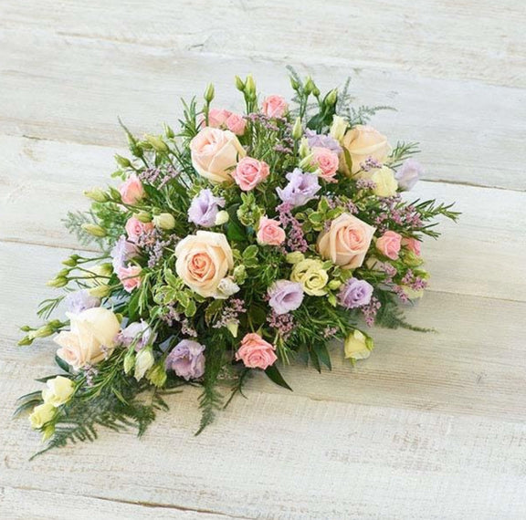 The teardrop casket spray is customisable and smaller than a traditional spray. Please contact us with any specific requests. Note that due to our unique location we have to use what we have in stock unless given enough notice, however, we will always do our best to accommodate preferences.
